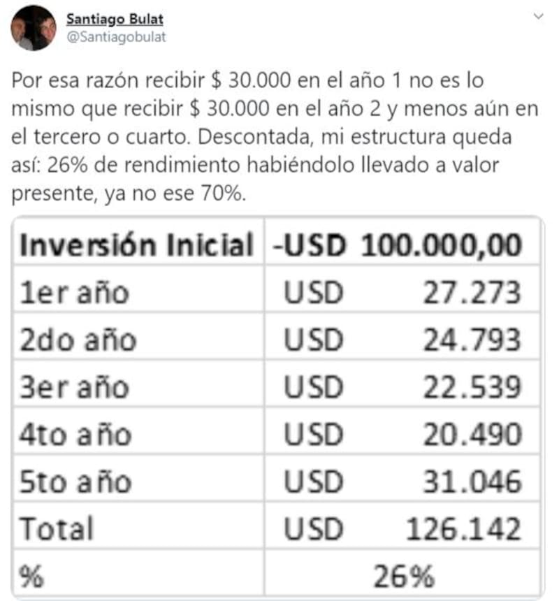 Si se tiene en cuenta la fórmula previamente detallada, según Bulat, “por esa razón recibir $ 30.000 en el año 1 no es lo mismo que recibir $ 30.000 en el año 2 y menos aún en el tercero o cuarto . De ese modo, el 70% de ganancia termina convirtiéndose en un 26% de rendimiento al llevarlo a valor presente.
