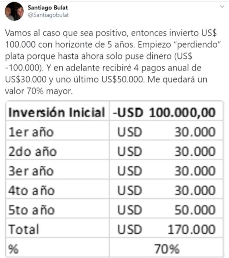 En su segundo posteo, Bulat detalló que cualquier tipo de proyecto o instrumento debe ser "valuado" antes de invertir en él. “Detalló que se deben tener en cuenta cuánto dinero se deberá desembolsar y cuánto recibirá más adelante .