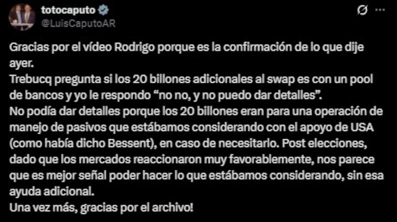 El jefe del Palacio de Hacienda citó un video de una entrevista que había dado en octubre, donde él mismo había confirmado que se trabajaba en “otra facilidad por otros 20.000 millones”, que se sumaba al swap acordado con la gestión de Donald Trump.