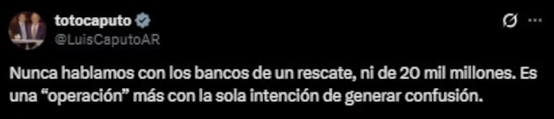 Un día antes, cuando crecieron las versiones de que el Tesoro de los EE.UU. dejaba en suspenso el paquete de u$s 20.000 millones y los bancos estadounidenses optaban por una línea de financiación a corto plazo más pequeña -de u$s 5000 millones-, Caputo también había apuntado en redes sociales.