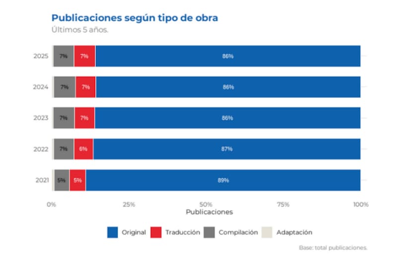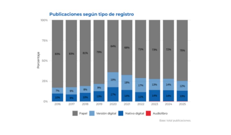 En paralelo, el papel mantiene su predominio (75% de los registros), mientras que el libro digital se estanca y el audiolibro sigue siendo marginal, lo que sugiere que la transformación tecnológica del sector aún es incipiente en la Argentina.