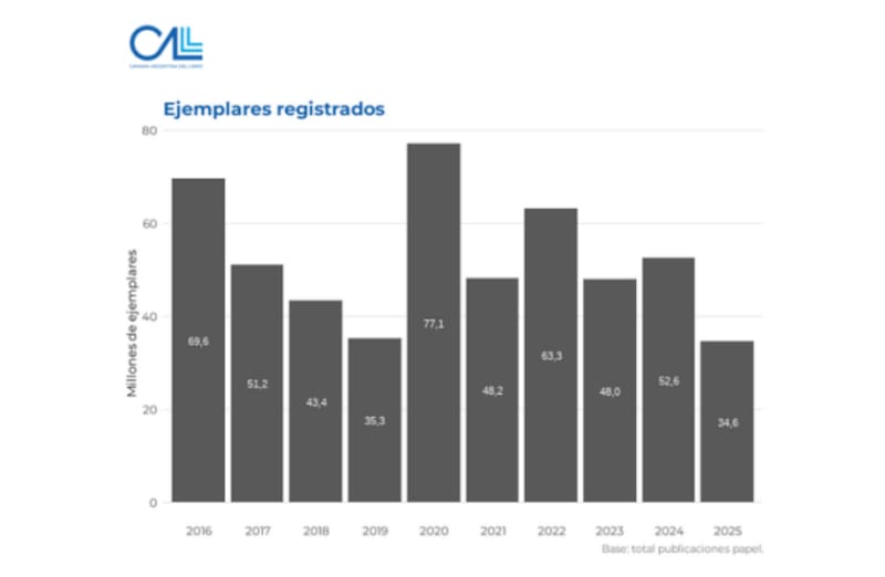 Según el informe de la Cámara Argentina del Libro (CAL), en 2025 se registraron 36.942 publicaciones, un 17% más que el año anterior, impulsadas principalmente por el crecimiento del formato papel. Sin embargo, ese dinamismo convive con una fuerte contracción del volumen: la tirada total cayó 34%, pasando de 52,6 millones a 34,6 millones de ejemplares