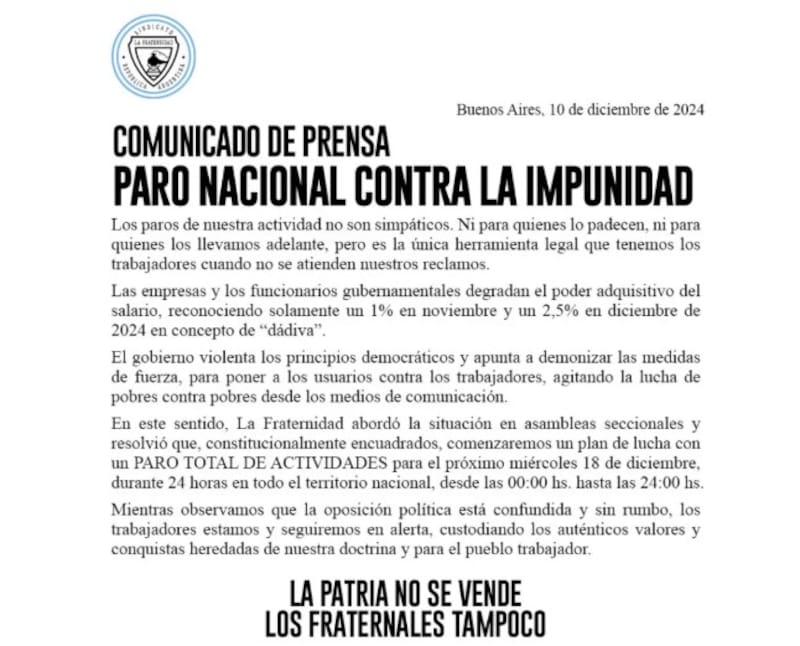 El gremio ferroviario La Fraternidad anunció este martes un nuevo paro nacional de trenesen disconformidad con la "pérdida y licuación de los salarios".