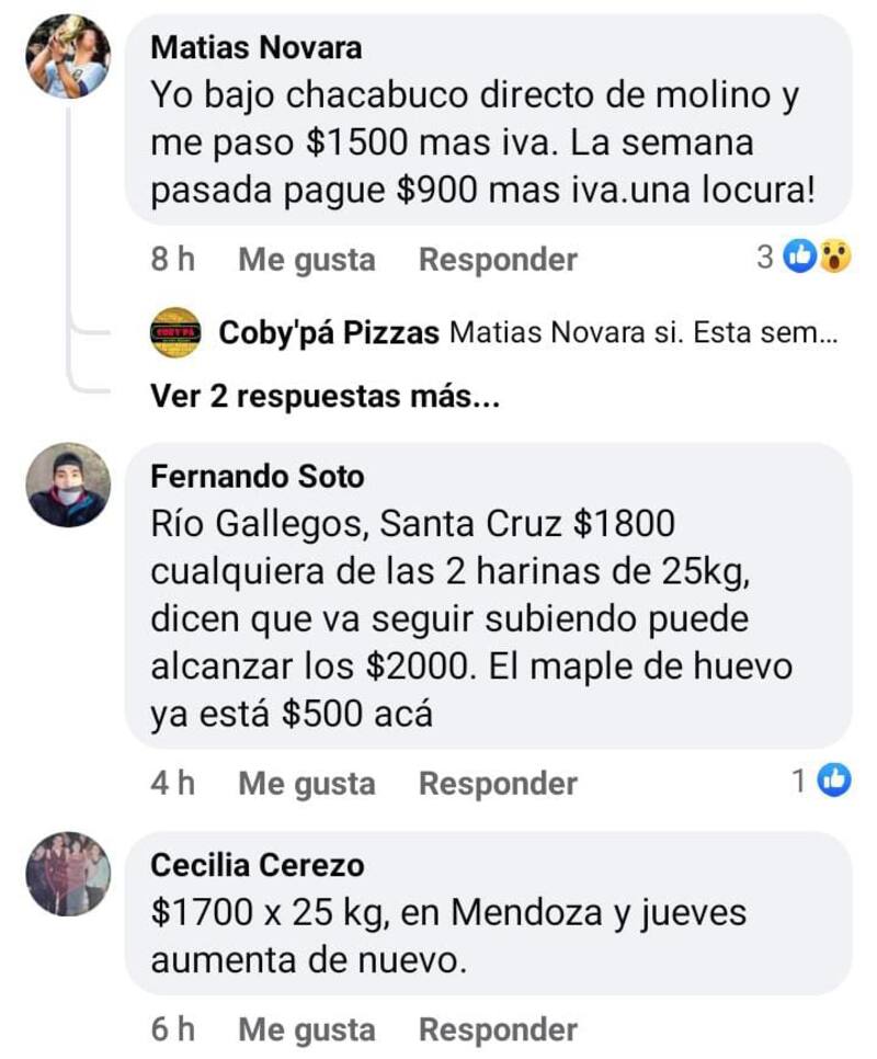 Cecilia Cerezo, por ejemplo, comenta que en Mendoza ya se piden $1700 por la bolsa de 25 kilos de harina y que puede haber más aumentos. En cambio, en Río Gallegos "cualquiera de las dos harinas cuesta $1800", informa Fernando Soto y adelanta que el maple de huevos puede volver a tener aumentos.