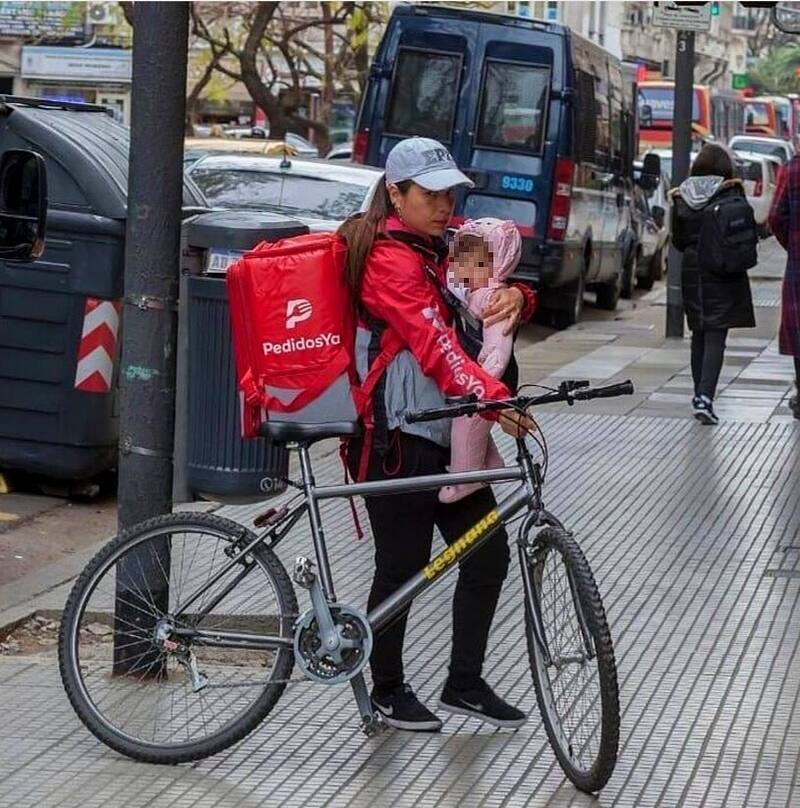 - La foto de una mujer con el uniforme de PedidosYa cargando a un bebé se hizo viral en las redes sociales. Muchos de los usuarios y políticos que compartieron la imagen aseguraron que reflejaba la precarización laboral, considerando que tenía que llevar a su hija al trabajo.