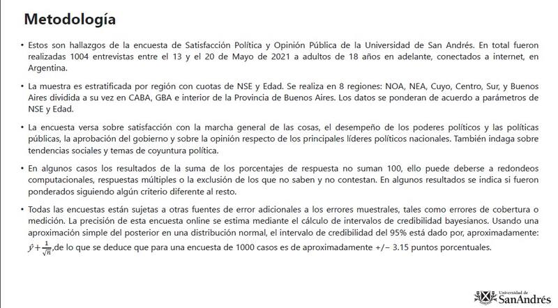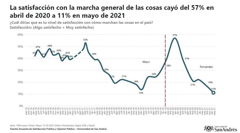 El relevamiento, que se publica cada dos meses, fue realizado entre el 13 y el 20 de mayo. En primer lugar, sobre la marcha general de las cosas, se observa una caída de 46 puntos porcentuales. En abril de 2020 llegaban al 57% quienes decían estar "algo satisfechos" o "muy satisfechos". Hoy son solo el 11%.