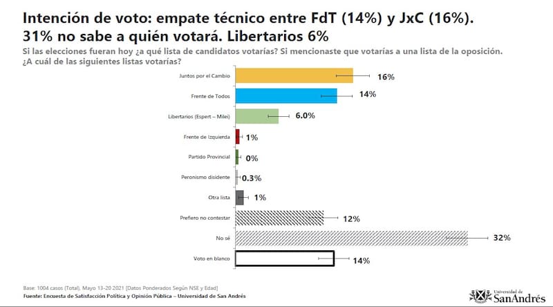 Entre quienes se vuelcan por alguna opción política, hay un empate técnico entre las dos grandes coaliciones: el 16% prefiere Juntos por el Cambio y el 14%, el Frente de Todos. Las expresiones libertarias, encarnadas por José Luis Espert y Javer Milei, trepan a los 6 puntos.