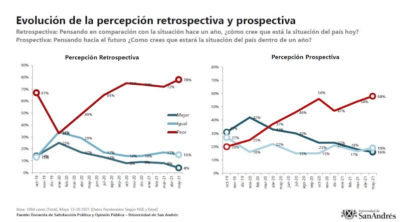 En medio de la segunda ola de contagios de Covid-19, y con índices de inflación y pobreza que no ceden, el pesimismo ganó terreno. En el plano retrospectivo, el 78% asegura que el país está peor que hace un año. Hacia el futuro la ecuación no mejora demasiado: el 58% está convencido de que en 2022 el país estará peor.
