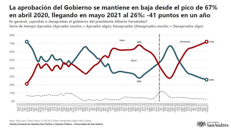 La aprobación del gobierno nacional da cuenta del mismo fenómeno. Tras haber tocado un techo del 67% hace trece meses, se desplomó al 26% en el actual relevamiento. Es el punto más bajo desde que se hace esta encuesta y supera al peor momento de Mauricio Macri: en mayo de 2019 había tenido 28% de aprobación.