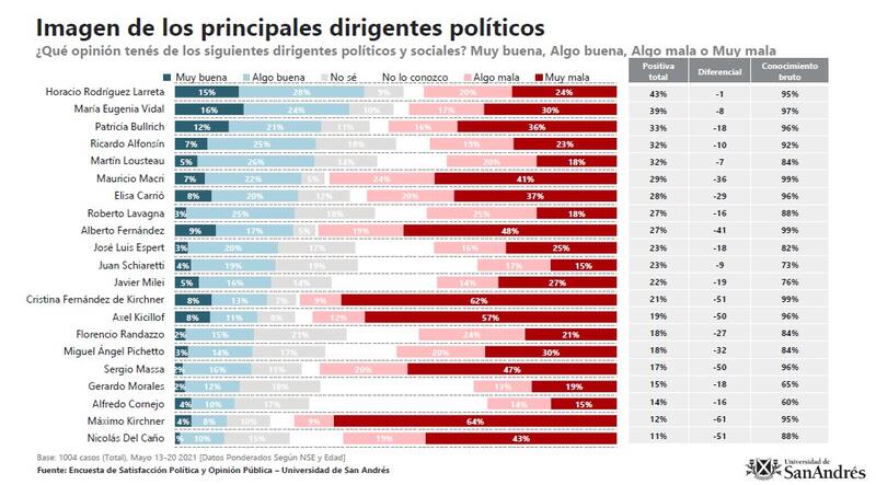 El descrédito sobre los políticos parece ser común a los distintos partidos: de los 21 dirigentes relevados, ninguno tiene imagen positiva. El que sale mejor parado es Horacio Rodríguez Larreta: tiene la mayor imagen positiva -43%- y el diferencial negativo es de 1 punto. En imagen positiva lo siguen María Eugenia Vidal y Patricia Bullrich, aunque en este caso con un diferencial negativo que llega a los 18 puntos.