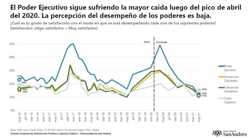 En el mismo sentido se mueve la curva desde el año pasado sobre la precepción del Poder Ejecutivo. Tras el pico de abril de 2020, la satisfacción cayó al 12%. Por primera vez, la Corte Suprema se encuentra a la cabeza, por encima también del Senado y Diputados. En todos los casos, la insatisfacción supera el 80%.