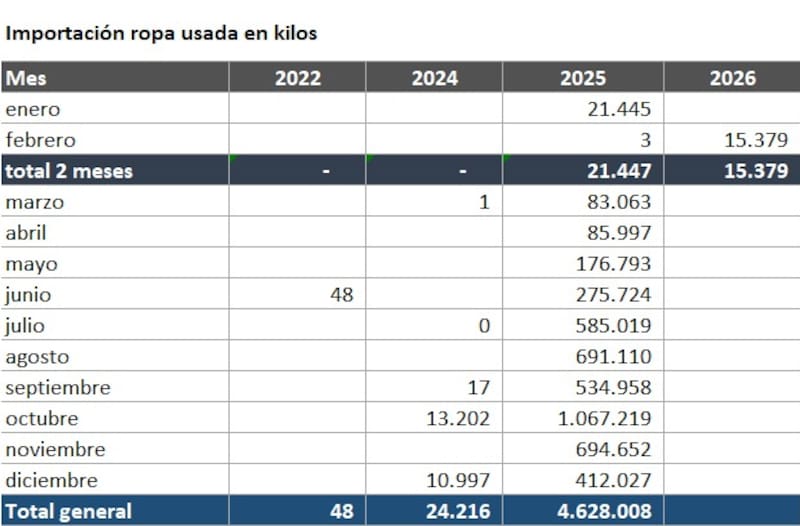 En total, durante 2025 ingresaron al país 4.628 toneladas de ropa usada, por un valor FOB cercano a u$s 4,7 millones, lo que resulta en un precio promedio de u$s 1,02 por kilo. Con fuerte predominio de Estados Unidos como origen, también aparecen Pakistán y China entre los principales proveedores.