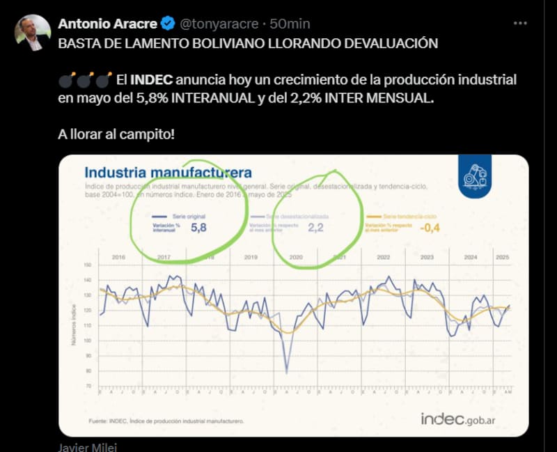 El índice de la serie desestacionalizada, en tanto, muestra una variación positiva de 2,2% respecto al mes anterior y el índice serie tendencia-ciclo registra una variación negativa de 0,4% respecto al mes anterior. De esta forma, todas las comparaciones dieron positivo, lo que fue motivo de celebración para el Gobierno. Sin embargo, como advirtió la consultora LCG, la recuperación de estos dos meses no se llega a compensar la baja del primer trimestre del año: opera 0,7% por debajo de dic-24 y 1% debajo de nov-23, lo que muestra un claro estancamiento.