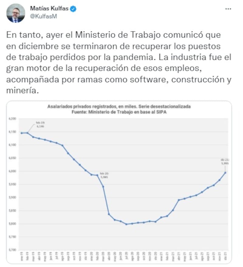 Kulfas puso el foco, además, en la mejora de los indicadores de empleo, recordando que según las estadísticas del Ministerio de Trabajo difundidas este martes, en diciembre ya se recuperaron todos los puestos de trabajo perdidos por la pandemia, y destacó que "la industria fue el gran motor de la recuperación de esos empleos, acompañada por ramas como software, construcción y minería".