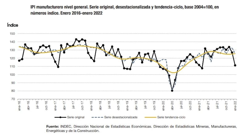 En despachos oficiales destacaron que pese a la caída de enero "el nivel de actividad industrial es alto, ubicándose 6,2% por encima del nivel pre-Covid de febrero de 2020 (serie sin estacionalidad) y superando en 4,1% el nivel de enero de 2020 y 4,0% el de enero de 2019", en la comparación con la serie original.