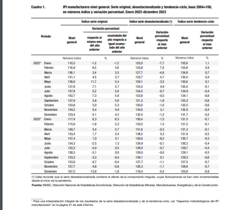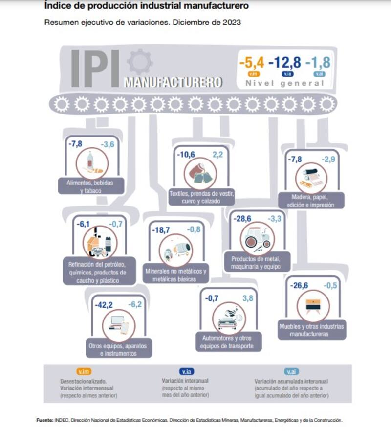 El Instituto Nacional de Estadística y Censos (INDEC) informó hoy que el Índice de Producción Industrial manufacturero (IPIm) experimentó una marcada contracción del 12,8% interanual durante el último mes del año 2023.