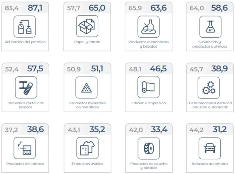 Solo cinco sectores mostraron niveles de utilización de la capacidad instalada por encima al nivel general: refinación del petróleo (87,1%), papel y cartón (65%), productos alimenticios y bebidas (63,6%), sustancias y productos químicos (58,6%) e industrias metálicas básicas (57,5%).