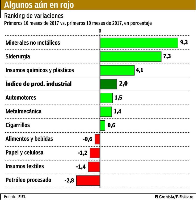 Entre los sectores, en los 10 primeros meses, comparado con igual período de 2016, la producción de minerales no metálicos lidera la suba, con un 9,3%. Le siguen la siderurgia, con 7,3% y el sector de químicos y plásticos, con 4,1%. Otros tres rubros registran una expansión menor al promedio de la industria, que fue de 2% en el acumulado: la automotriz, un 1,5%; metalmecánica, 1,4%; y los despachos de cigarrillo, 0,6%.