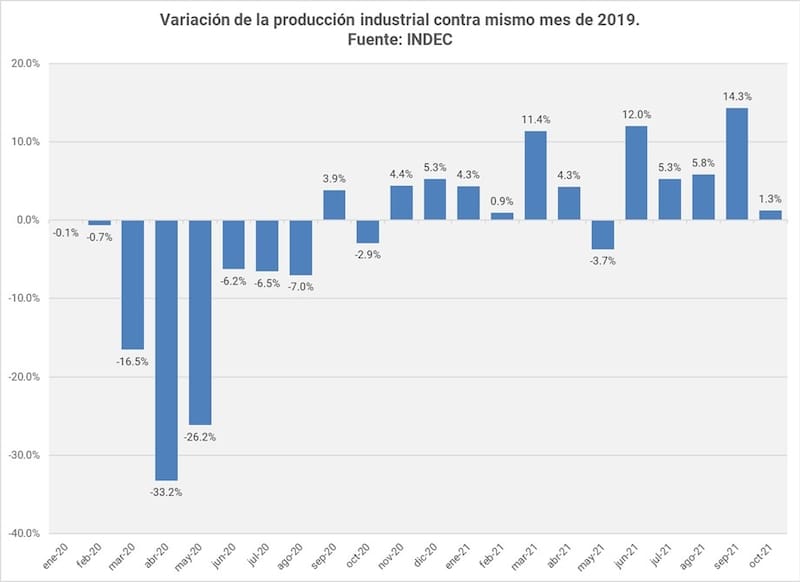 Fuentes oficiales destacaron además que "la industria acumula doce meses en alza y se encuentra 1,3% por encima del nivel de octubre 2019", agregando que además están "en un nivel muy similar al de octubre de 2018 (-0,6%)".
