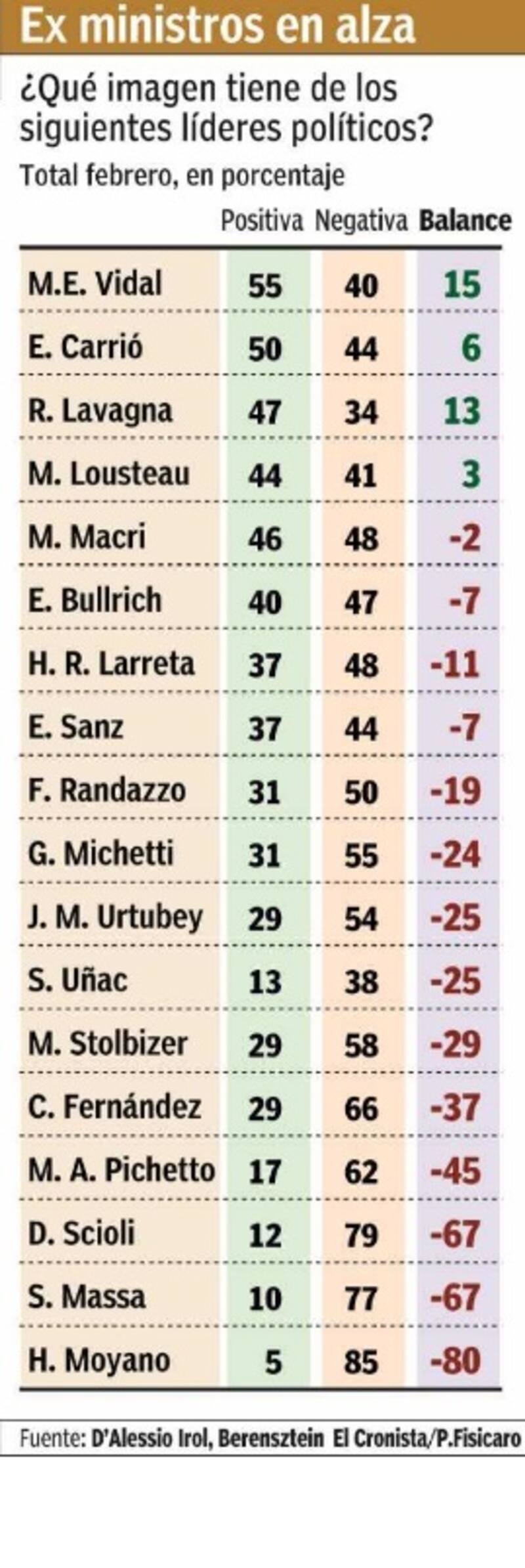 En efecto, si bien el presidente Mauricio Macri no perdió imagen respecto de la medición previa y tanto la gobernadora María Eugenia Vidal como la diputada Elisa Carrió ascendieron en su imagen positiva, aparecen las figuras de dos ex ministros de Economía como Lavagna y Martín Lousteau entre los mejores calificados. Un reflejo del momento que atraviesa una economía marcada por la inflación.