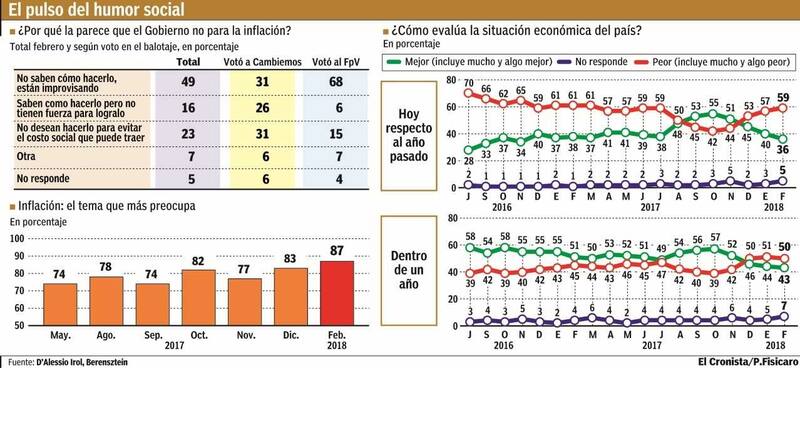 Así lo refleja la última entrega del Monitor del Humor Social y Político, que realizó D'Alessio Irol/Berensztein en exclusiva para El Cronista. Pese a que el Indec reveló que la actividad económica creció 2,8% en 2017, la construcción se disparó 19% interanual en enero y la industria mejoró 2,6% en el mismo período, el relevamiento del que participaron 1408 adultos en todo el país exhibió que para un 59% de los consultados la situación económica está peor que hace un año, mientras que apenas un 36% consideró que se encuentra mejor, el guarismo más bajo en los últimos 15 meses. En la misma línea, la proyección sobre una mejoría dentro de un año retrocedió al 43% de las opiniones. Hoy uno de cada dos entrevistados observa un peor horizonte económico.