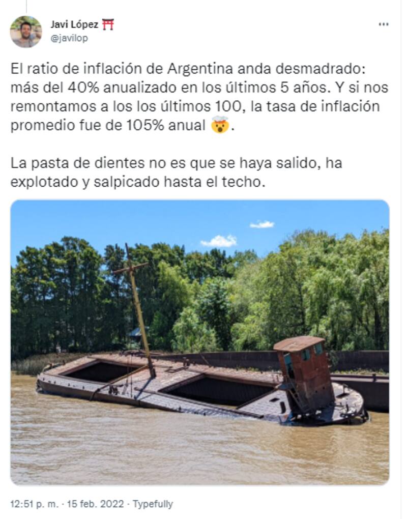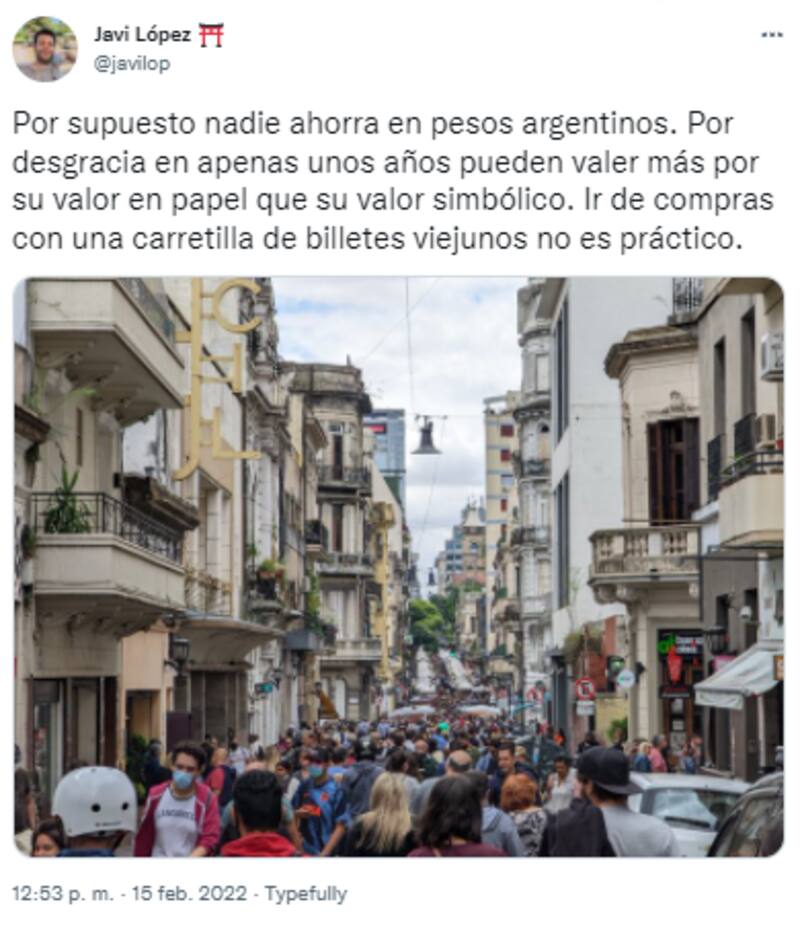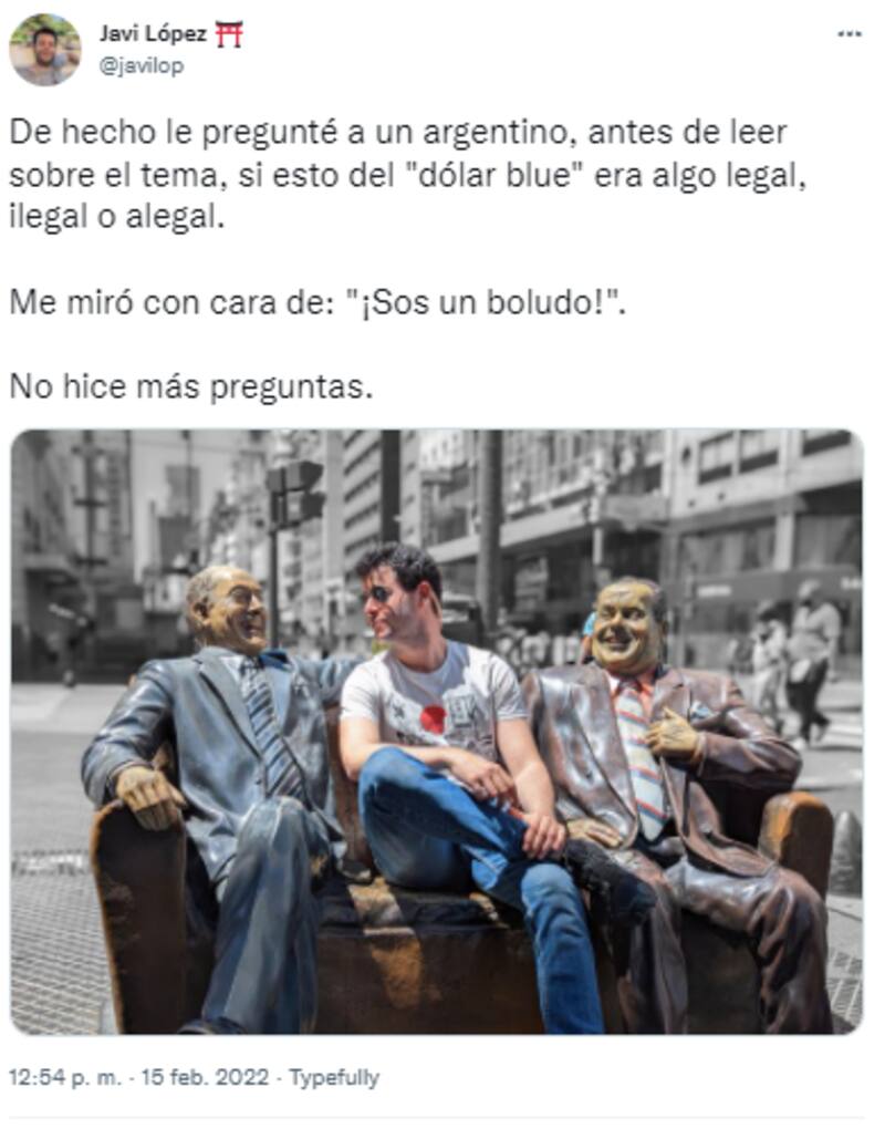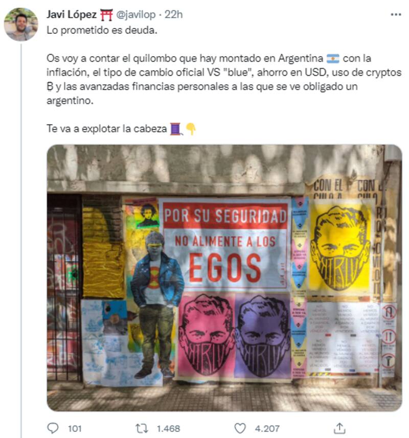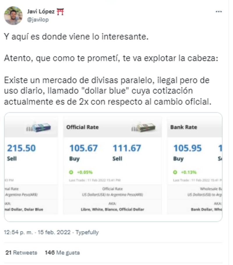 "Os voy a contar el quilombo que hay montado en Argentina con la inflación, el tipo de cambio oficial VS "blue", ahorro en USD, uso de cryptos y las avanzadas finanzas personales a las que se ve obligado un argentino. Te va a explotar la cabeza", explicó Javier López en el primer tuit de un extenso hilo en la red social que se volvió viral.