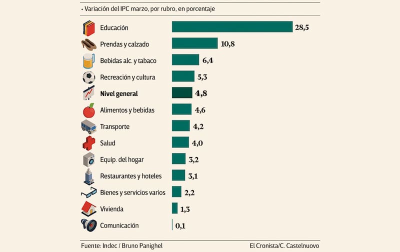 Si bien marzo tradicionalmente es un mes de alta estacionalidad, como se registró en el rubro de educación y su suba de 28%, el 4,5% de la medición núcleo es otra arista preocupante y evidencia la inercia de la expansión monetaria del año pasado sobre los precios.
