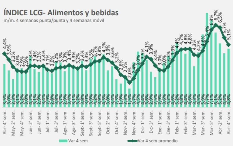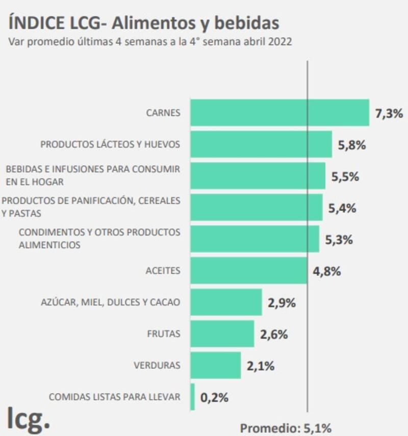 Del relevamiento de LCG se deduce que los principales motores de la inflación en alimentos y bebidas en las últimas cuatro semanas son Carnes, con un salto de 7,3% acumulado; Lácteos y huevos (5,8%); Bebidas e infusiones (5,5%); Panificados, cereales y pastas (5,4%); mientras que Condimentos y otros alimentos aumentaron 5,3% en el mes y Aceites el 4,8%.