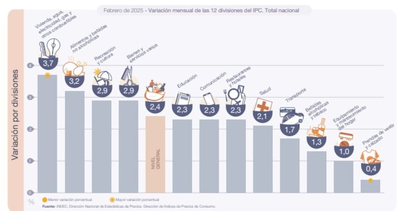 En tanto, las dos divisiones que registraron las menores variaciones en febrero de 2025 fueron Equipamiento y mantenimiento del hogar (1,0%) y Prendas de vestir y calzado (0,4%).