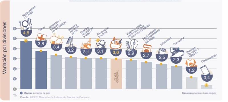 También se registró un mayor crecimiento en los precios de Restaurantesy hoteles (4,8% vs. 3,1% en junio) y Recreación y cultura (3,1% vs. 2,2% en junio) por aumentos en hotelería y demás rubros relacionados con el turismo debido a las vacaciones de invierno-