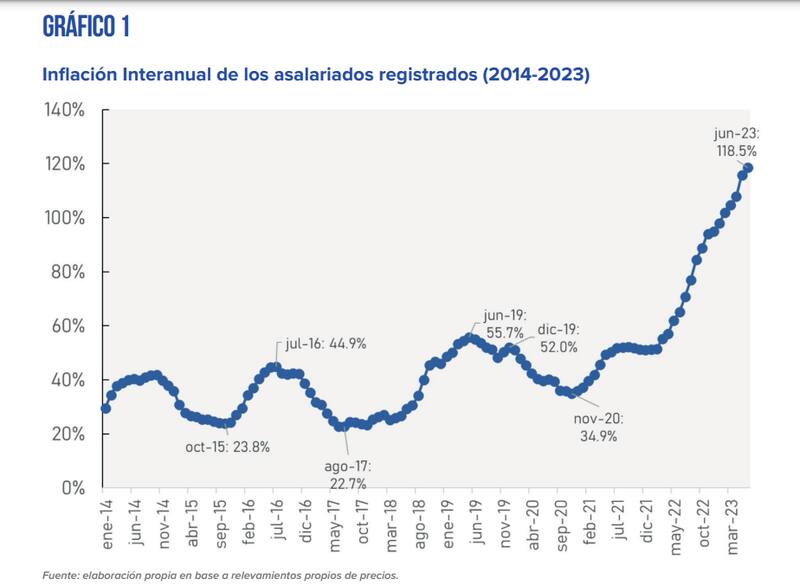 El informe destaca que en los primeros seis meses del año, la inflación acumulada fue del 52,5%, lo que se traduciría en un 132,5% si se proyecta para el resto del año. Además, la inflación interanual, es decir, la comparación con el mismo mes del año anterior, alcanzó el 118,5% y mostró su decimoséptima aceleración consecutiva.