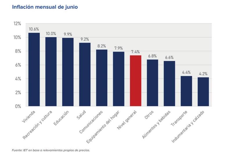 En cuanto a los factores que impulsaron la inflación en junio, los expertos del IET señalan que el rubro de Vivienda registró el mayor incremento, con un 10,6%, impulsado por aumentos en electricidad, expensas y alquileres. Le siguen Recreación y cultura (+10%), Educación (+9,9%), Salud (+9,2%), Comunicaciones (+8,2%) y Equipamiento y mantenimiento del hogar (+7,9%). Por debajo de la media se encuentran Otros bienes y servicios (+6,8%), Alimentos y bebidas (+6,6%), Transporte (+4,4%) e Indumentaria y calzado (+4,2%).