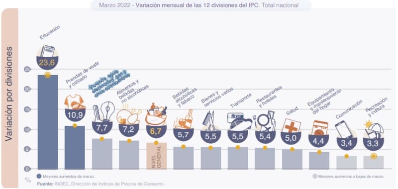 El fuerte incremento de la inflación del mes pasado es el resultado del aumento que se registró en alimentos y bebidas no alcohólicas, educación, indumentaria, así como vivienda, servicios (electricidad, agua) y combustibles.