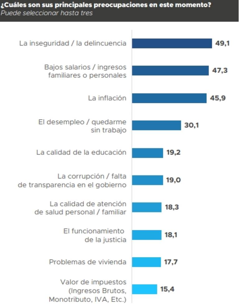 En la encuesta en la que se pueden elegir hasta tres opciones, el top 5 de las principales preocupaciones de los bonaerenses son: La inseguridad/la delincuencia (49,1%), los bajos salarios (47,3%), la inflación (45,9%), el desempleo (30,1%) y la calidad de la educación (19,2%).