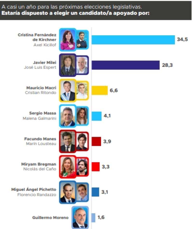 A la cabeza se encuentra el gobernador Axel Kicillof, con 47,5% de aprobación y 49,2% de rechazo. Lo sigue la vicepresidente Victoria Villarruel con 46,4 positivo y 42,7 negativo. Cristina Kirchner tiene un diferencial negativo de -10, con 43,9% de apoyo y 53,2 de rechazo. Muy cerca está el presidente Javier Milei, con 42,9 "verde" y 52% de "rojo".