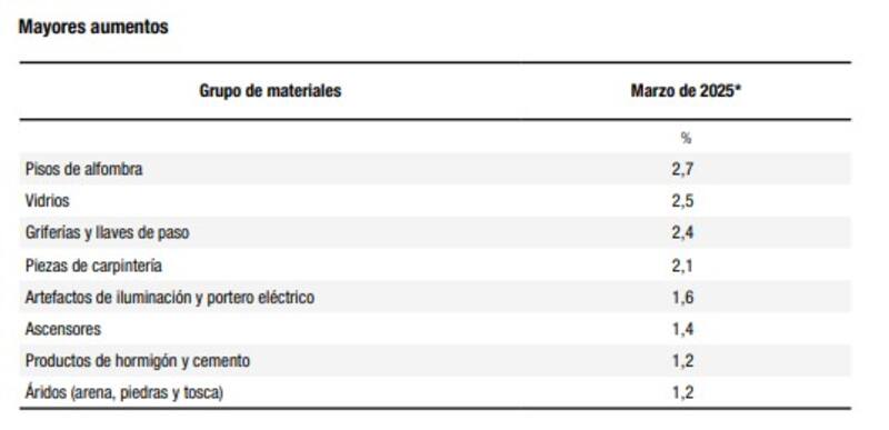 Este resultado surge como consecuencia de las alzas de 0,6% en el capítulo "Materiales" y de 0,8% en el capítulo "Gastos generales"; y de la baja de 0,1% en el capítulo "Mano de obra".