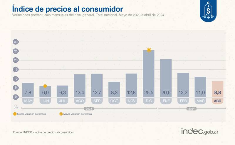 La inflaciónde abril fue del 8,8% según reveló el Instituto Nacional de Estadística y Censos (INDEC) y de esta manera alcanzó el 289,4% interanual. De esta manera se consolida la desaceleración de los precios que busca el Gobierno y rompe el piso de los dos dígitos por primera vez en la gestión de Javier Milei.