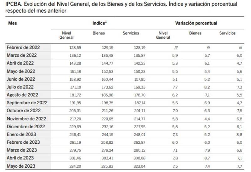 Durante el mes de mayo los bienes registraron una suba de 7,4%, por debajo de los Servicios que aumentaron 7,7%, por los ajustes tarifarios. En lo que va de 2023, los bienes acumularon una suba de 40,3% y los Servicios de 41,7%. En términos interanuales, la suba es de 113% en el primer caso y 115% en servicios.