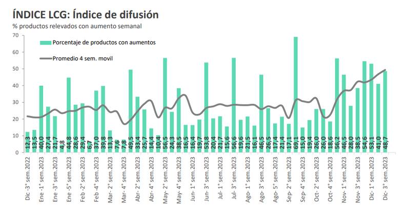 "El porcentaje de productos con aumentos semanales continúo elevado en 49%", alertaron desde la consultora a cargo del director ejecutivo, Javier Okseniuk. Una cifra levemente inferior al momento pico que se registró en los últimos días de octubre con el 56,2%.