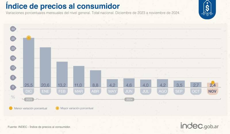 El Instituto Nacional de Estadística y Censos (INDEC) dio a conocer este miércoles el dato de la inflación de noviembre que fue del 2,4% y acumuló en el año una variación de 112,0%.