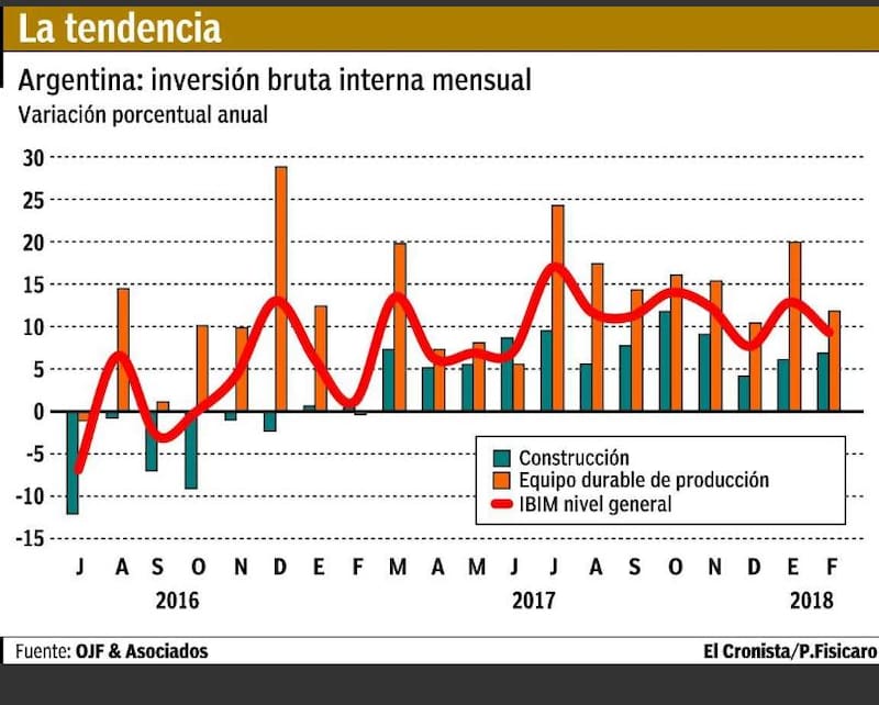El relevamiento mensual, que elabora la consultora Orlando Ferreres y Asociados (OJF), señala que en febrero la inversión bruta interna mensual (IBIM) creció 9,3% interanual contabilizando el volumen físico, esto es dejando de lado el efecto de los precios.
