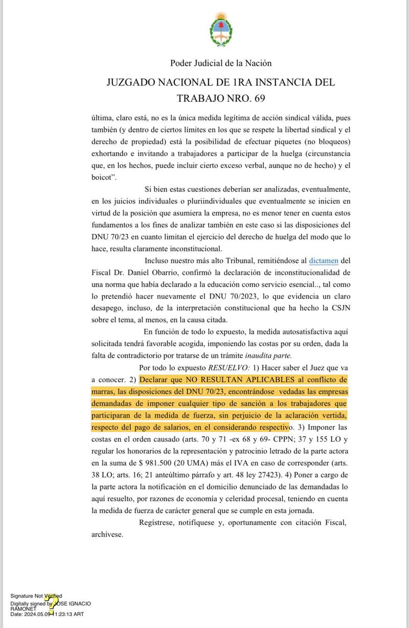 "Declarar con grado de certeza que las disposiciones del capítulo laboral del DNU 70/2023 se encuentran suspendidas para todos los trabajadores y empleadores del país a partir del 3.1.2024, y hasta tanto recaiga sentencia definitiva en el expediente 56.862/2023", detalló el documento en su artículo 1°.