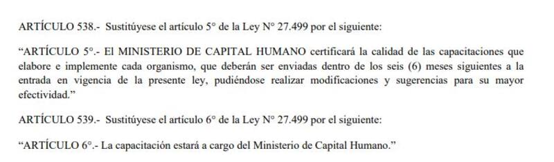 El mismo reemplazo de organismos se repite en otro de los cambios que introduciría el nuevo texto, en los artículos 5°, 6° y 7°, cuando se indica que será la cartera que dirige Sandra Pettovello la encargada de "certificar" la calidad de las capacitaciones, entre otras funciones.