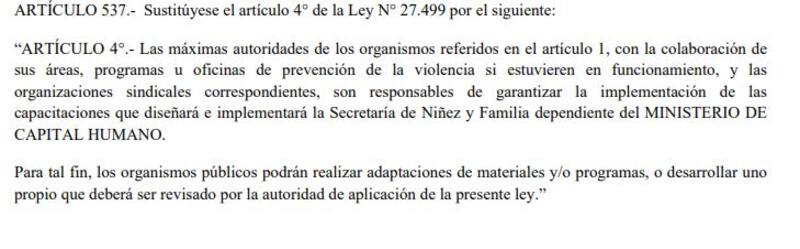 Por otra parte, se plantea eliminar al Instituto Nacional de las Mujeres como autoridad de aplicación y se lo reemplaza por el Ministerio de Capital Humano, en el que recae prácticamente tanto los contenidos como las decisiones acerca de las capacitaciones.