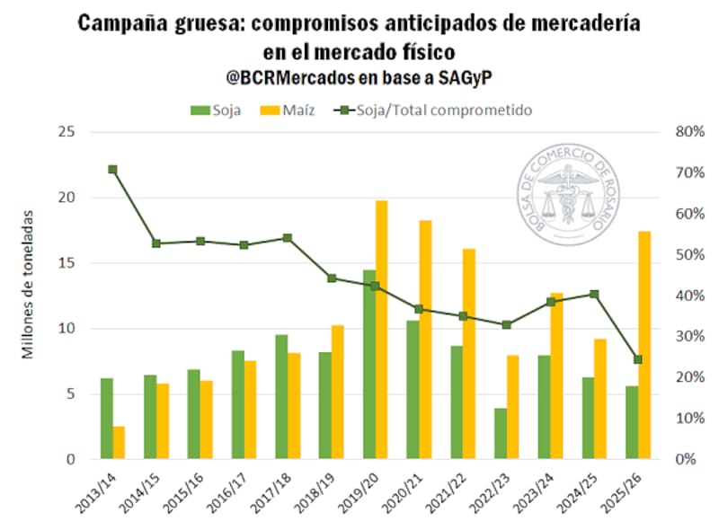 La campaña gruesa 2025/26 se lanza con particularidades en la comercialización anticipada de granos, destacó un informe de la Bolsa de Comercio de Rosario (BCR); el maíz duplica la de la fase anterior, alcanzando 17,4 millones de toneladas comprometidas antes de marzo, lo que representa el 28% de la producción esperada.