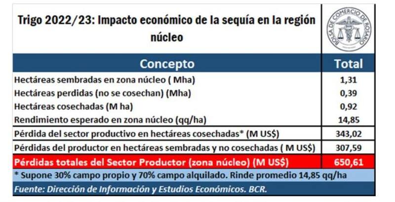 "Este deterioro en la producción es particularmente grave en la zona núcleo, diezmando los ingresos del sector productor", señalaron desde la BCR y explicaron que con los nuevos valores la pérdida estimada para los productores de zona núcleo asciende a los 650 millones de dólares, considerando un rinde promedio de 15 qq/ha y 391.000 hectáreas de superficie perdida.