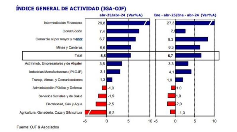 Los sectores que más se destacaron en abril fueron la intermediación financiera, la explotación de minas y canteras, con más de tres años de crecimiento ininterrumpido; y el comercio. A este le siguió la industria manufacturera.