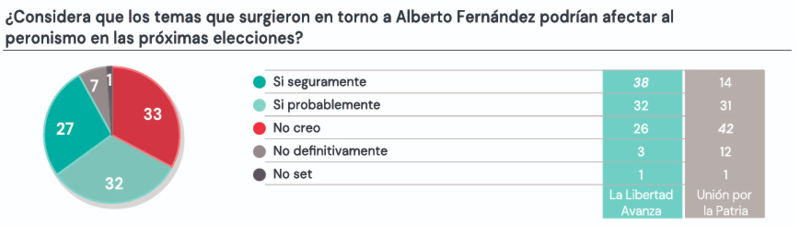 Y es que del otro lado de la grieta política la situación no es mejor. Por el contrario, un 70% de los entrevistados considera que los casos que involucran al ex presidente Alberto Fernández le restarán chances al peronismo para el año próximo. Y entre los dirigentes con mejor imagen solo aparecen Axel Kicillof con 34%y más lejos Cristina Kirchner, que registra 26%.