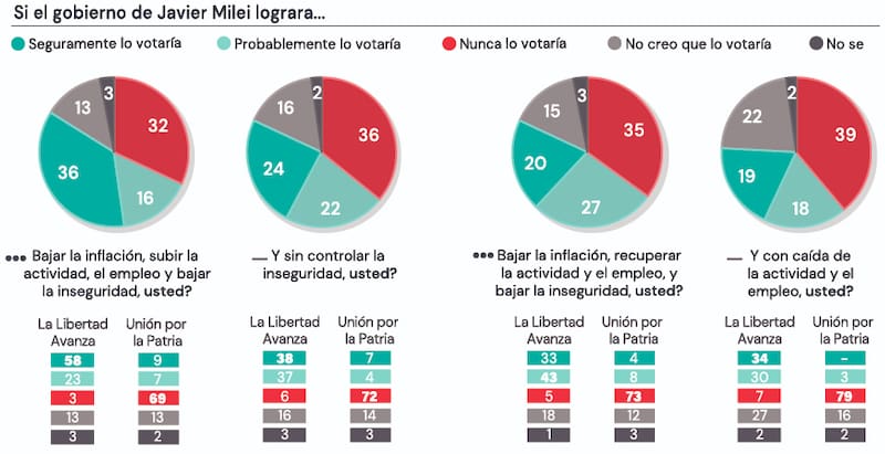 Pero pese a la mejor imagen oficialista, el resultado electoral no está garantizado. El estudio reflejó que sólo un 36% de los encuestados dijo que seguramente votaría por representantes del Gobierno el año próximo si se produce una combinación de baja de inflación e inseguridad con suba del nivel de actividad y del empleo (58% de los votantes libertarios de 2023), mientras que otros 16% señaló que probablemente lo haría.