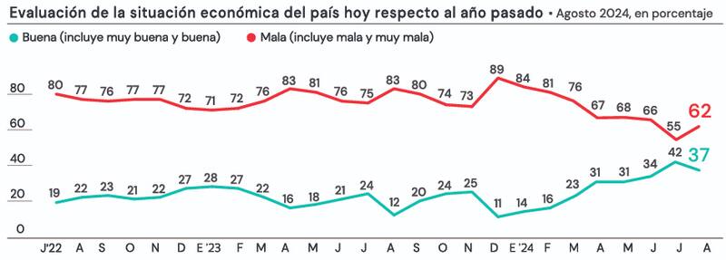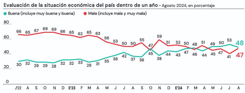 En esa línea muestra que, mientras un mayoritario 62% de los encuestados percibe un empeoramiento de la economía nacional -entre ellos, cuatro de cada diez votantes de Milei el año pasado-, las opiniones se reparten casi por igual a la hora de plantear cómo se estará dentro de 12 meses.